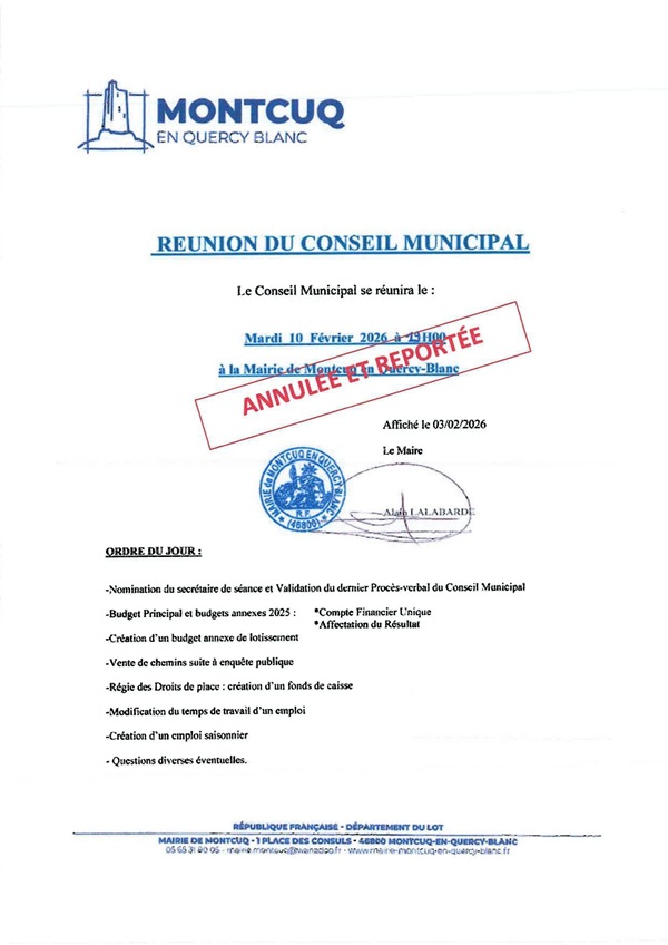 Conseil Municipal le 10 Février 2026 ANNULÉE ET REPORTÉE