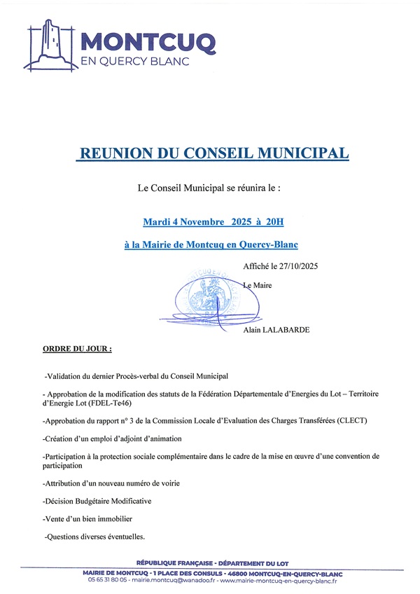 La prochaine réunion du Conseil Municipal se tiendra le : Mardi 4 novembre 2025 à 20h00 à la Mairie de Montcuq en Quercy-Blanc L’ordre du jour est accessible en cliquant sur le bouton « Télécharger »