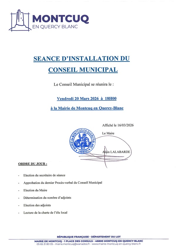 La prochaine réunion du Conseil Municipal se tiendra le : Vendredi 20 Mars 2026 à 18h00 à la Mairie de Montcuq en Quercy-Blanc