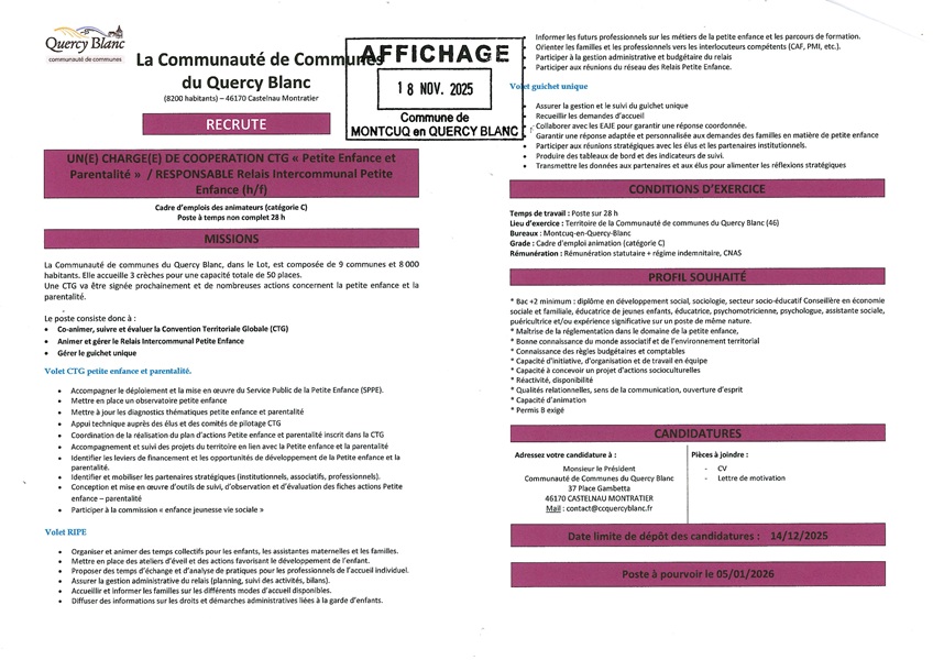 La Communauté de Communes du Quercy Blanc recrute pour le poste de Chargé(e) de coopération CTG « Petite enfance et Parentalité »